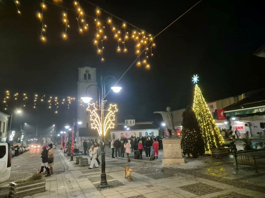 Градот е украсен со убаво новогодишно осветлување и разни светлечки реквизити, кои внесуваат радост и сјај на секој агол.