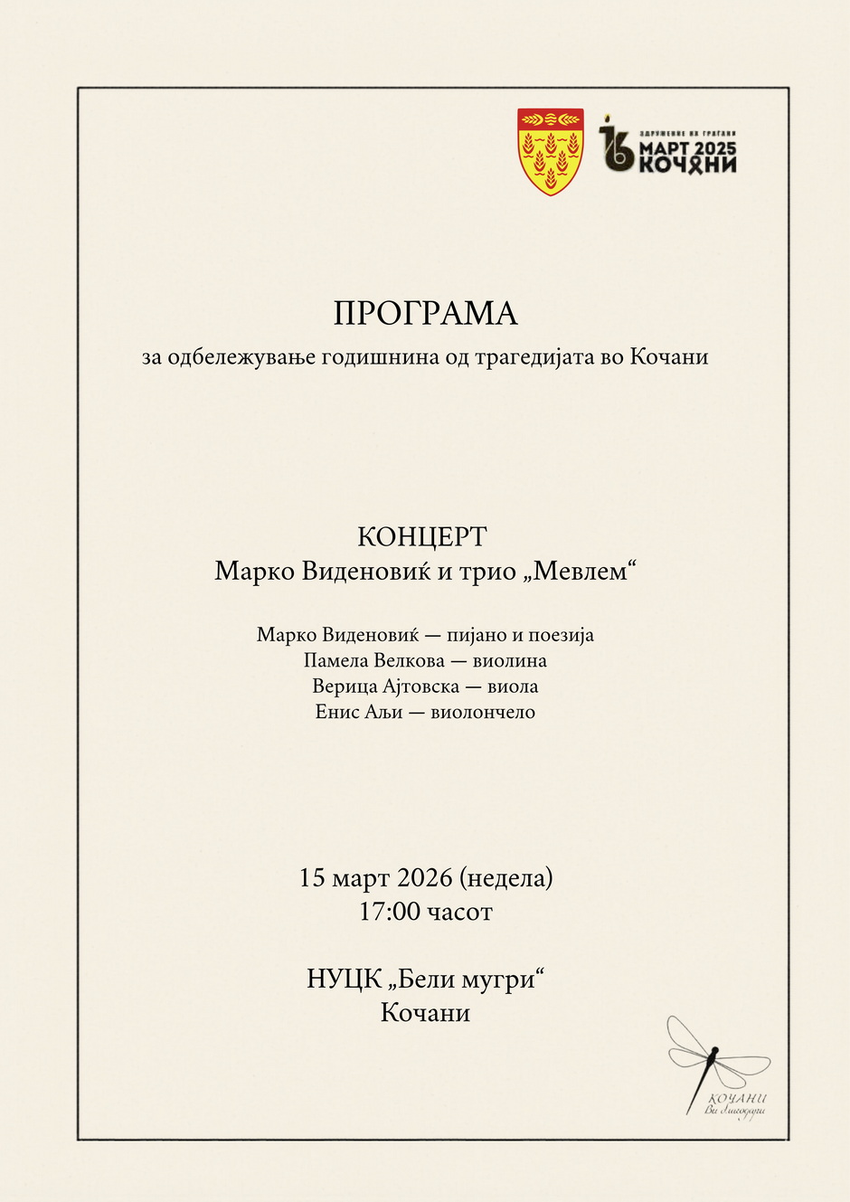 Концерт на Марко Виденовиќ и гудачкото трио „Мевлем“ – во сеќавање на загинатите и на повредените во Кочани