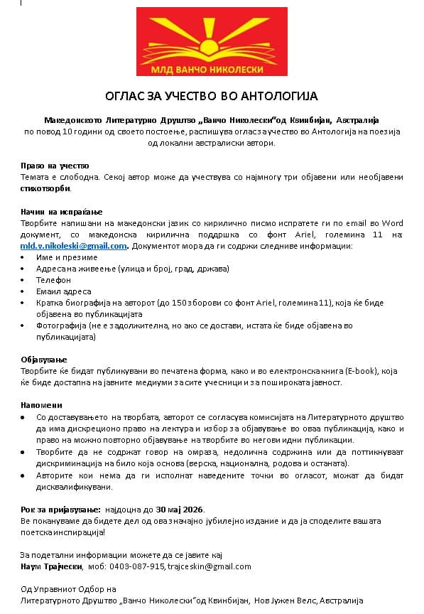 По повод своето 10 годишн постоење Македонското Литературно Друштво „Ванчо Николески“ Квинбијан-Австралија објави повик за учество на литературни автори кои што пишуваат поезија на Македонски литературен јазик со кирилично писмо во процесот на создавање на нова книга антологија која ќе биде издадена во печатена и електронска форма.