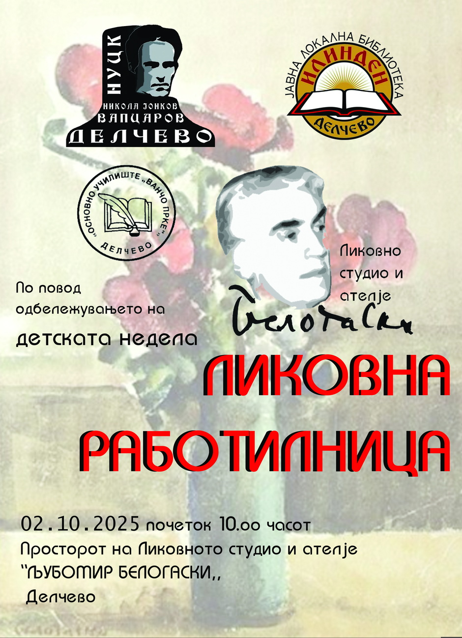 Одговорните за ликовната дејност при НУЦК “Никола Јонков Вапцаров” Делчево во рамки на богатата соработка со ЈЛБ “Илинден” Делчево за наредниот четврток- 02.10.2025 година со почеток во 10.00 часот во Ликовното студио и атеље “Љубомир Белогаски” Делчево кое се наоѓа на вториот кат во Спомен домот АСНОМ во Делчево организираат преубав настан за млади и талентирани ученици во соработка со наставничката по Ликовна уметност Антонела Манева.