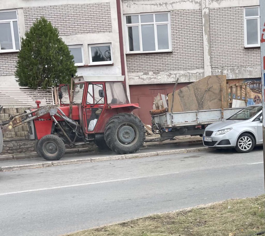 Кој е сопственик на прикажаниот трактор и приколка паркиран пред централната училишна зграда од страната на техничките простории и магацински делови на училиштето што стои товарен со дрвени предмети?