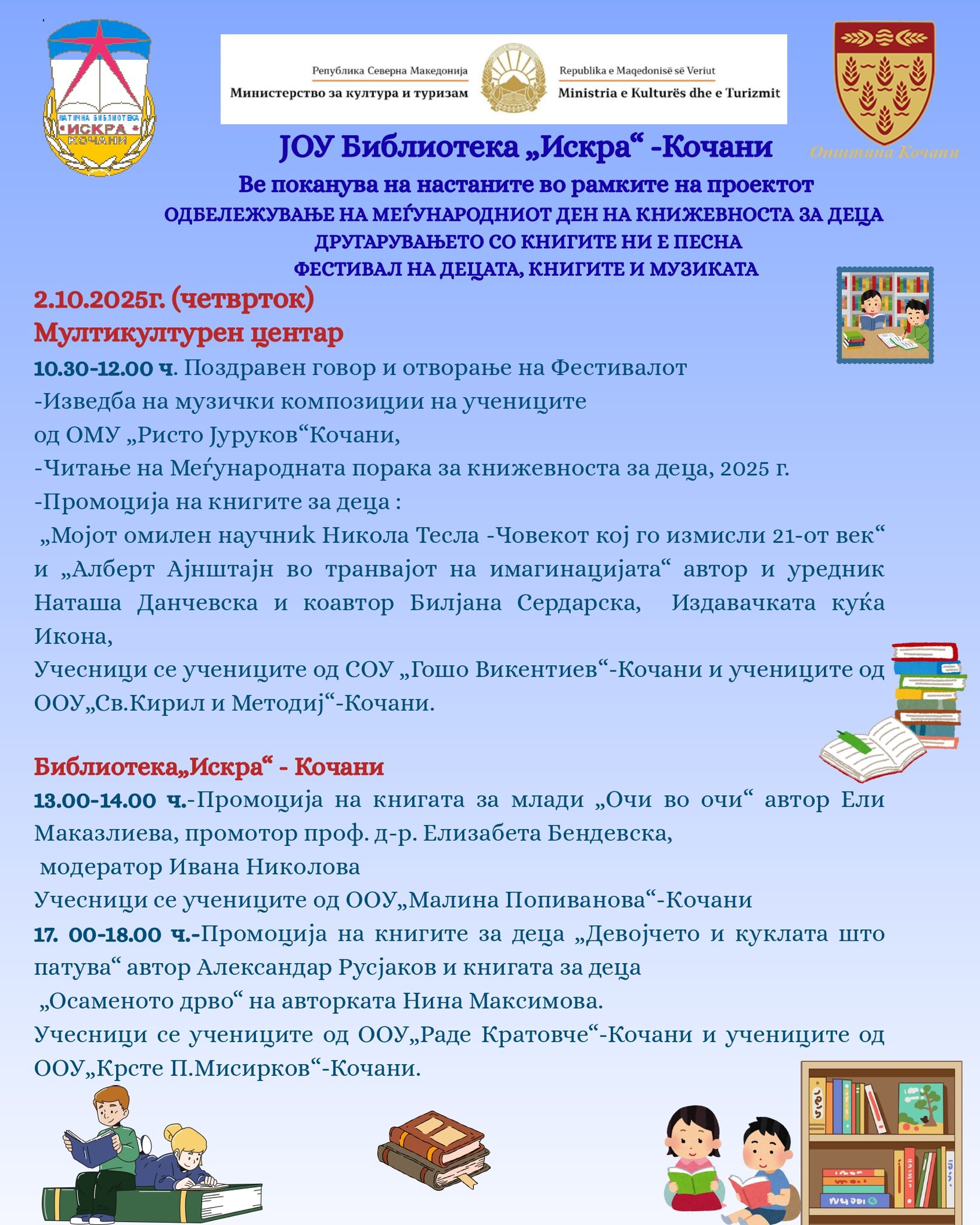 Од денеска, 2 октомври 2025 г., во 10:30 ч. во салата на МКЦ во Кочани, ЈОУБ „Искра“ го започнува одбележувањето на Меѓународниот ден на книжевноста за деца.
