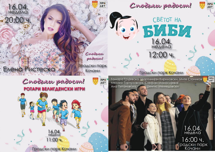 “В недела, на 16 април, во рамките на Велигденскиот хепенинг, од 11 ч. ќе се одржат Ротари детски игри; во 12 ч. е „Светот на Биби“; од 16 ч. е настапот на македонски музичари меѓу кои и Тамара Грујевска, Мартинијан Кириловски, Мите Стоилов, Мелани Тарчуловска, Стефан Манасијевиќ, Ана Петановска и Џенгис Мемедовски, а од 20 ч. е настапот на Елена Ристеска.”