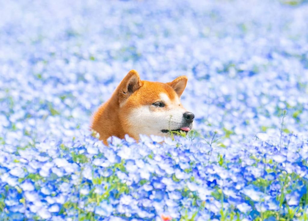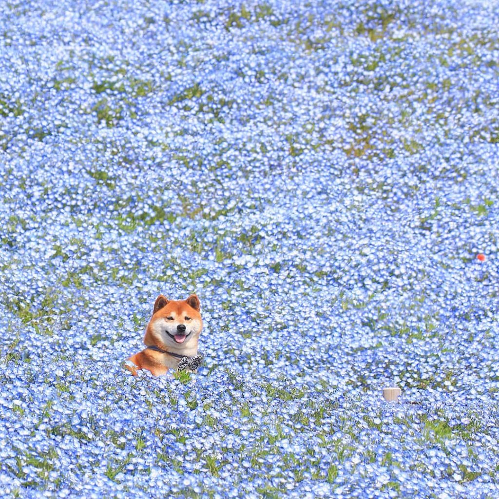 Во моментов, немофилите се флора, обезбедувајќи ги сите важни незапирливи страни на паркот. А кој би бил подобар модел од саканата икона во Јапонија, шиба ину?