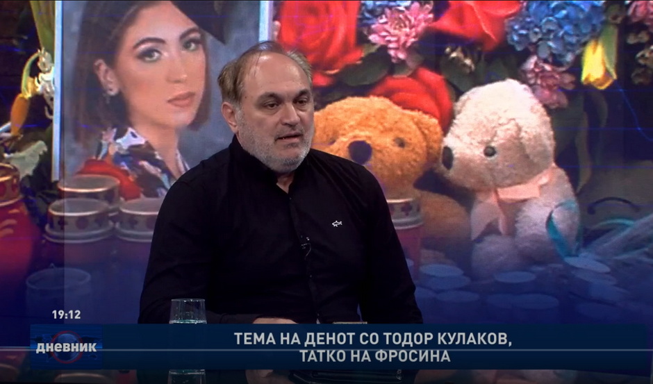 „Благодарам до сите институции кои први изреагираа на оваа голема наша мака. Благодарам на управата за санкции на Александар Пандов, на МВР, на Владата, на премиерот, на партијата ВМРО-ДПМНЕ која излезе со јасна иницијатива во врска за разрешување на судијката“, ова вечерва го истакна Тодор Кулаков, таткото на починатата Фросина во гостување во „Тема на денот“ во централниот дневник на телевизија Сител.